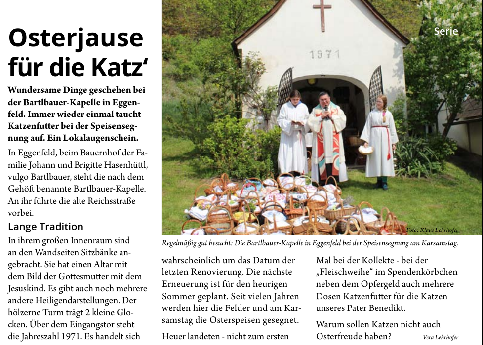 Als Dorfkapelle finden sich hier die Bewohner von Eggenfeld zu verschiedenen Anlässen: Osterspeisensegnung, Maiandachten